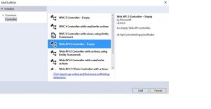 برای افزودن یک Web API Controller شما باید بر روی پوشه Controllers در Solution Explorer راست کلیک کنید و روی Add و سپس Controller کلیک کنید.اکنون همانطور که در زیر نشان داده شده است ، از پنجره Add Scaffold، گزینه Web API 2 Controller – Empty را انتخاب کنید، .
