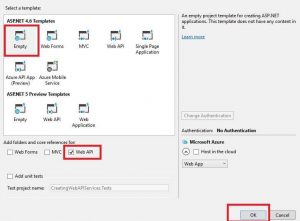 2)به آدرس File>New>Project>ASP.NET Web Application Template بروید و یک پروژه با نام دلخواه خود ایجاد کنید سپس پنجره زیر باز می شود. قالب empty را انتخاب کنید و گزینه Web API را مانند تصویر زیر تیک بزنید.