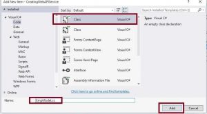 بر روی پوشه Model در برنامه Web API ایجاد شده راست کلیک کنید، نام کلاس را EmpModel یا هر نام دلخواه انتخاب کنید و روی OK کلیک کنید.