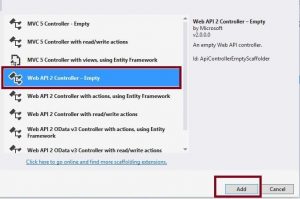 بر روی فولدر Controller کلیک راست کرده و Web API 2 Empty controller به صورت زیر ایجاد کنید.