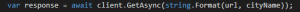 متدGetAsync() را از کلاسHttpClientفراخوانی کرده و پارامترهای آن را بهstring.formatتبدیل می کند.