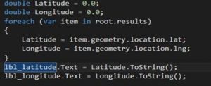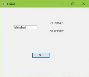 بعد از ایجاد یک پروژه دوتا labelو یک text boxو یکbutton در فرم اضافه میکنیم و به labbel اولی نام lbl_latitudeو به label دومی نام lbl_longitude , و به textbox نام txbx_City را اختصاص میدهیم.