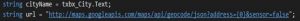 محتوی دکمه که اسم آن را txbx_city گذاشتیم را در یک متغیر به نام cityName که از نوع string است قرار میدهیم.در اینجا از فرمت string برای ورودی کاربر در URL استفاده کردیم.