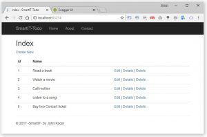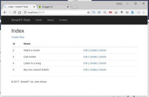 مقداری را که متد Post بازگشت داده است را در قسمت Body می بینید. مقدار id که بازگردانده شده است ممکن است با مقداری که ما به سمت WebAPI ارسال کرده ایم متفاوت باشد. چون این مقدار ممکن است کلید اصلی جدول ما باشد و سیستم به صورت خودکار آخرین عدد قابل تخصیص را به رکورد مورد نظر تعیین کرده و برای ما بازگشت داده باشد. حال اگر صفحه Index را که لیست ToDo ها در آن نمایش داده می شوند را Refresh کنیم نتیجه را چنین خواهیم دید: